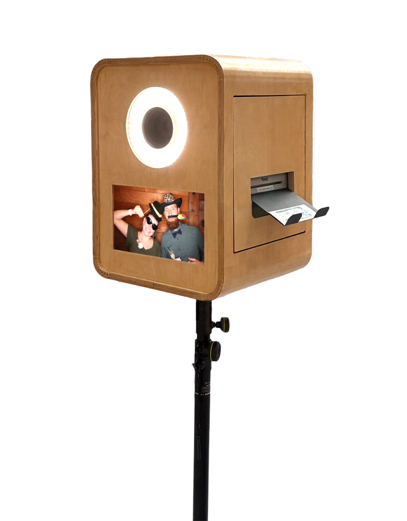 De stijlvolle houten uitstraling van de photobooth past naadloos in elk feest en neemt weinig ruimte in beslag.