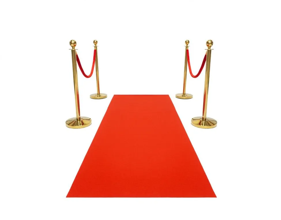 4 gouden paaltjes met een rood koord en een rode loper. Let op: Alleen voor binnen.